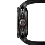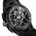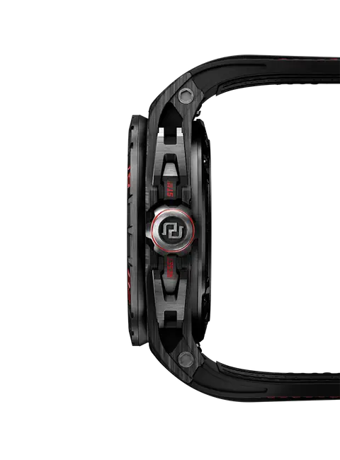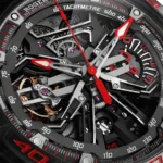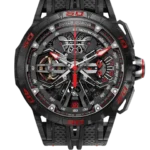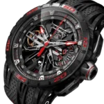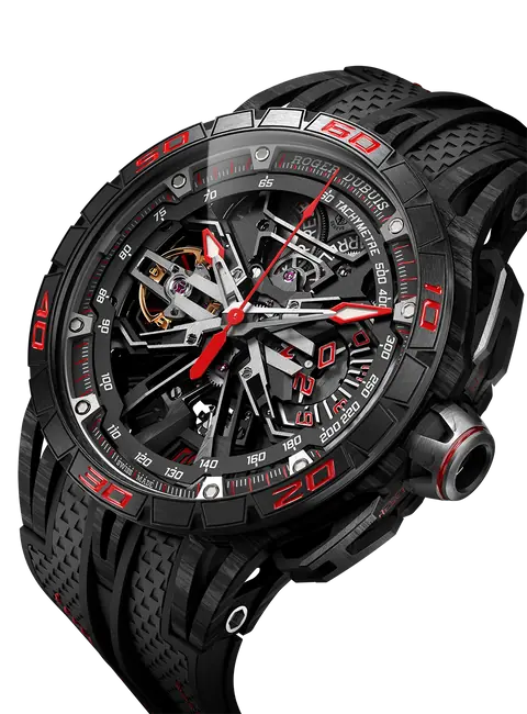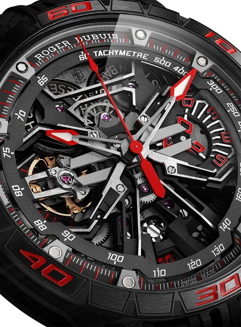 Combining two admired complications, the minute repeater tourbillon belongs to the very exclusive world of Grandes Complications. Wound-up by two micro-rotors, the watch features a 72h power reserve. Achievement of the highly-skilled Roger Dubuis watchmakers, the watch also houses some useful functions such as an ‘all or nothing’ indicator to avoid a partial striking of the time, a tone playback indicator to control visually the progression of the repeater and a function indicator to check the crown position (winding or setting) to avoid using the minute repeater while setting the time which could alter the well-being of the caliber. Housed in a SMC carbon case, this watch is a blend of contemporary and expressive Haute Horlogerie.