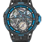 Combining two admired complications, the minute repeater tourbillon belongs to the very exclusive world of Grandes Complications. Wound-up by two micro-rotors, the watch features a 72h power reserve. Achievement of the highly-skilled Roger Dubuis watchmakers, the watch also houses some useful functions such as an ‘all or nothing’ indicator to avoid a partial striking of the time, a tone playback indicator to control visually the progression of the repeater and a function indicator to check the crown position (winding or setting) to avoid using the minute repeater while setting the time which could alter the well-being of the caliber. Housed in a SMC carbon case, this watch is a blend of contemporary and expressive Haute Horlogerie.